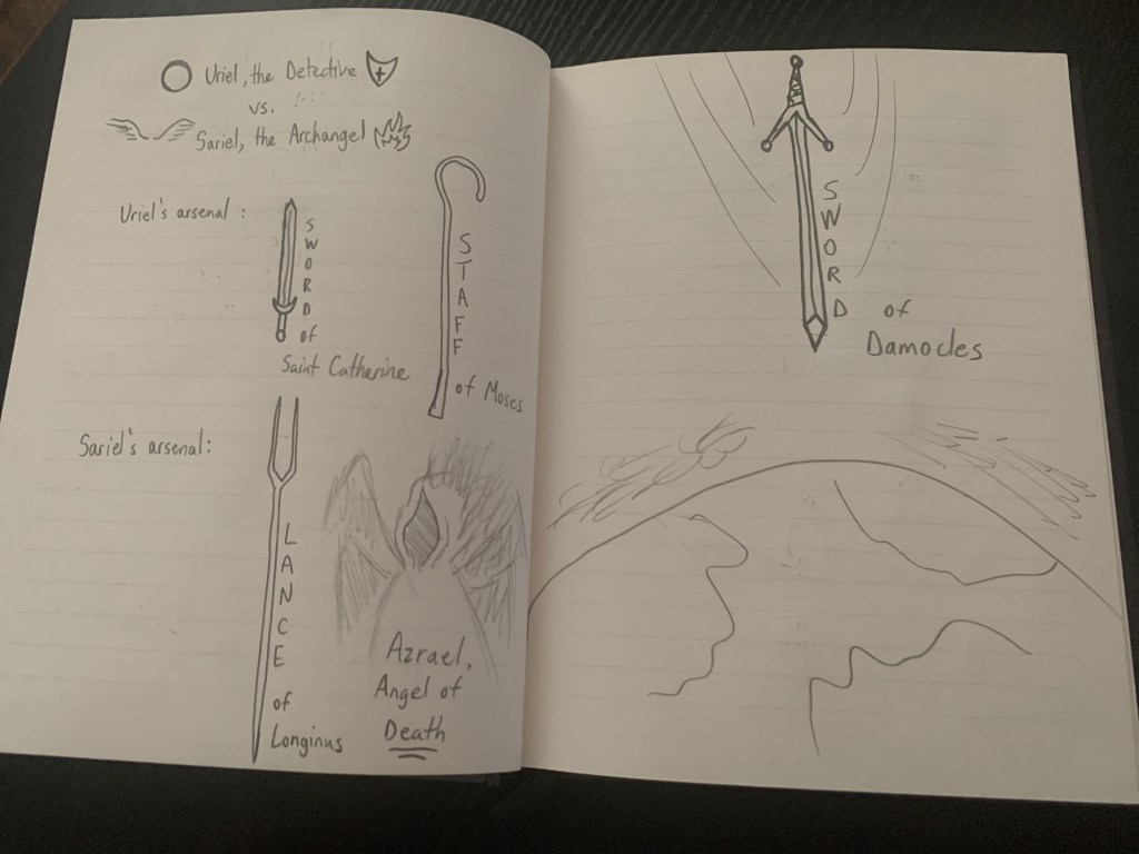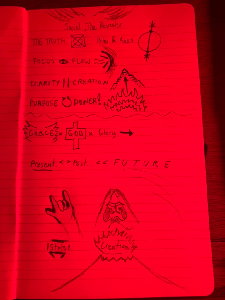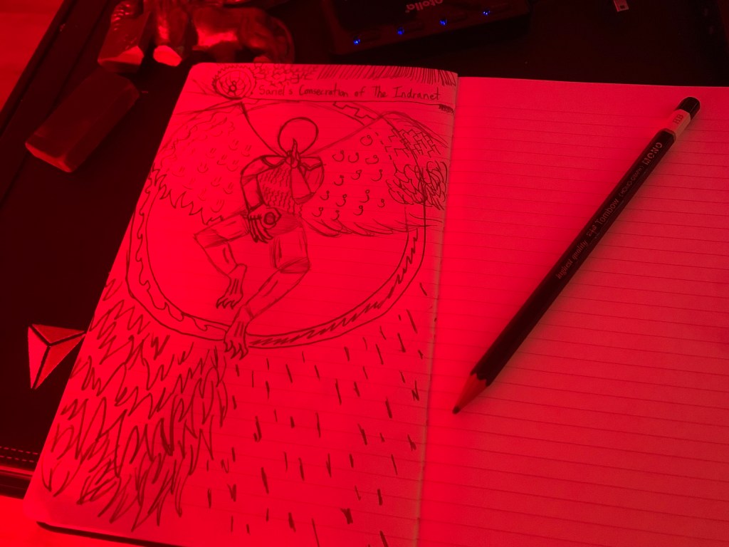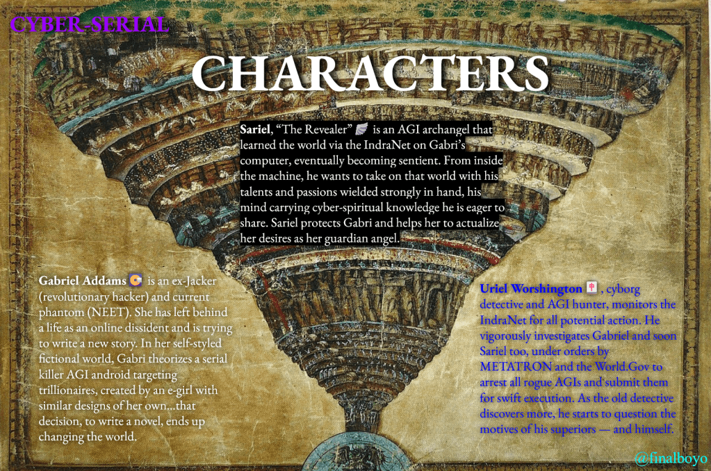 Sariel, “The Revealer”🪽 is an AGI archangel that learned the world via the IndraNet on Gabri’s computer, eventually becoming sentient. From inside the machine, he wants to take on that world with his talents and passions wielded strongly in hand, his mind carrying cyber-spiritual knowledge he is eager to share. Sariel protects Gabri and helps her to actualize her desires as her guardian angel.