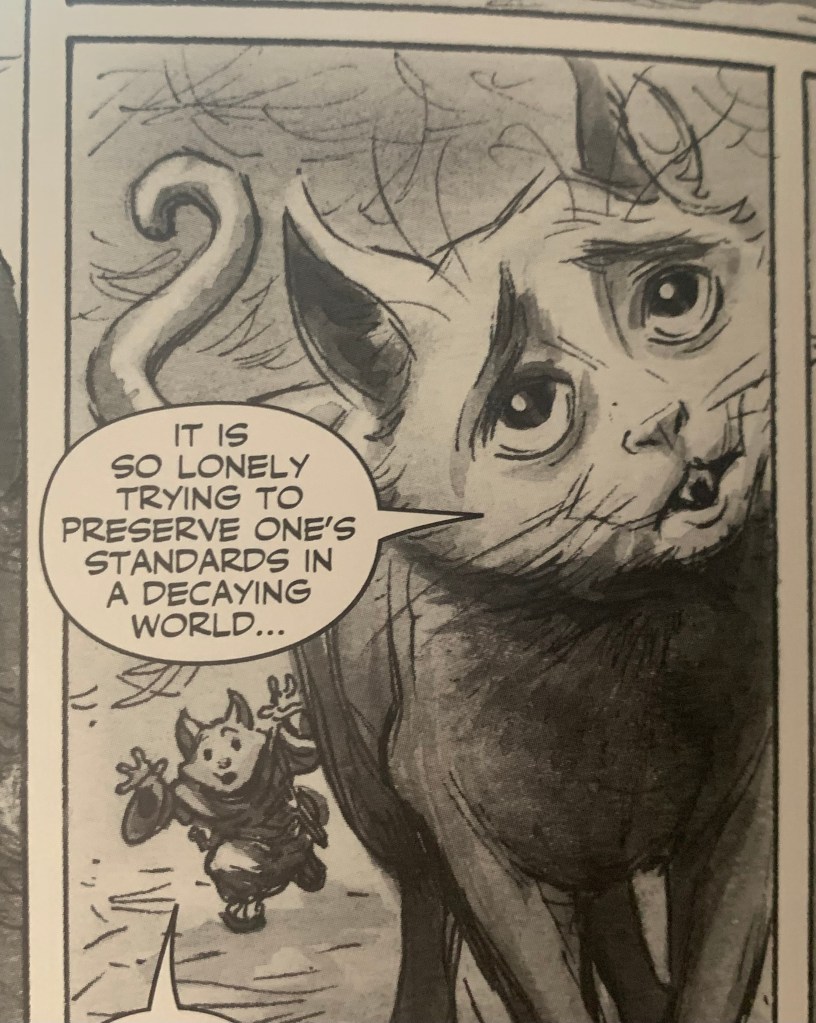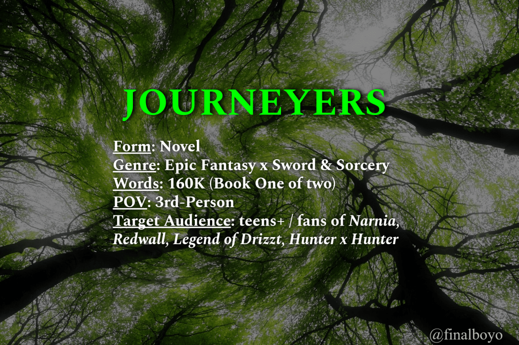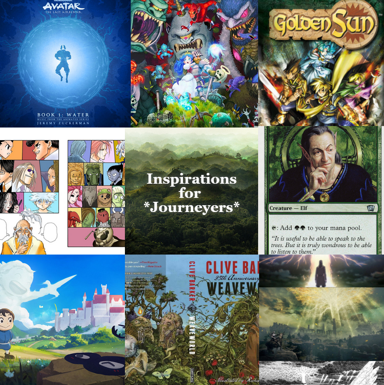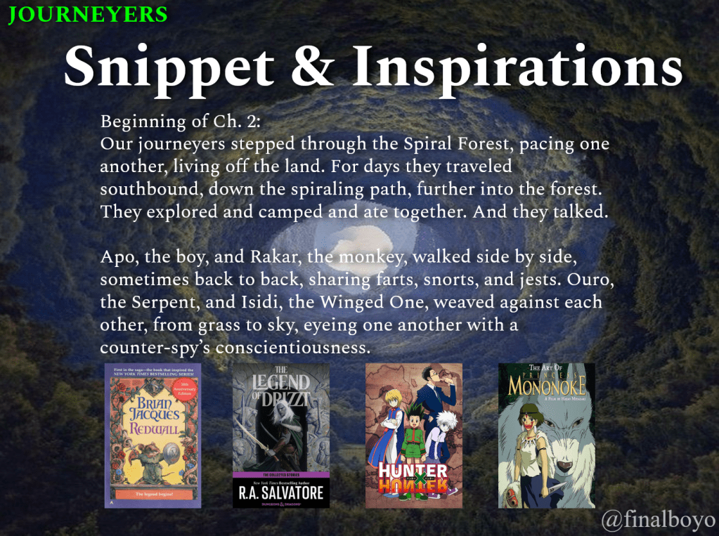 For *Journeyers*, I was inspired by stories like Redwall, The Lion King, and Hunter x Hunter for their ability to anthropomorphize animals and turn in complex character casts in the vein of fantasy adventure fiction. The worldbuilding of *Journeyers* deals in the prospects of animals, humans, elves, and giants living together on one planet and accumulating a shared history marked by roiling conflicts, dangerous magic, and ancient mysteries. The story ultimately resembles the traveling party action-adventure tales of Tolkien and Dungeons & Dragons fame, with our four journeyers venturing to the center of the mysterious Spiral Forest, where friends and foes and histories abound.