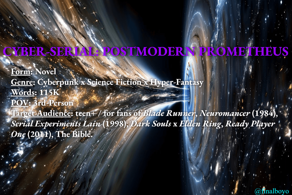 Target Audience: teen+ / for fans of Blade Runner, Neuromancer (1984), The Terminator (1984), Serial Experiments Lain (1998), Summer Wars (2009), Dark Souls x Elden Ring, Ready Player One (2011), The Bible.