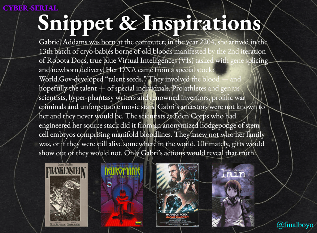 For *Cyber-Serial*, I was inspired by the psychical aspects of the Internet in Serial Experiments Lain and the possibilities of creatively rogue androids such as HAL-9000 from 2001: A Space Odyssey and David from Prometheus. Other major influences include Do Androids Dream of Electric Sheep? / Blade Runner, Neuromancer, Cyberpunk (ttrpg), Ready Player One, and Dark Souls x Elden Ring.