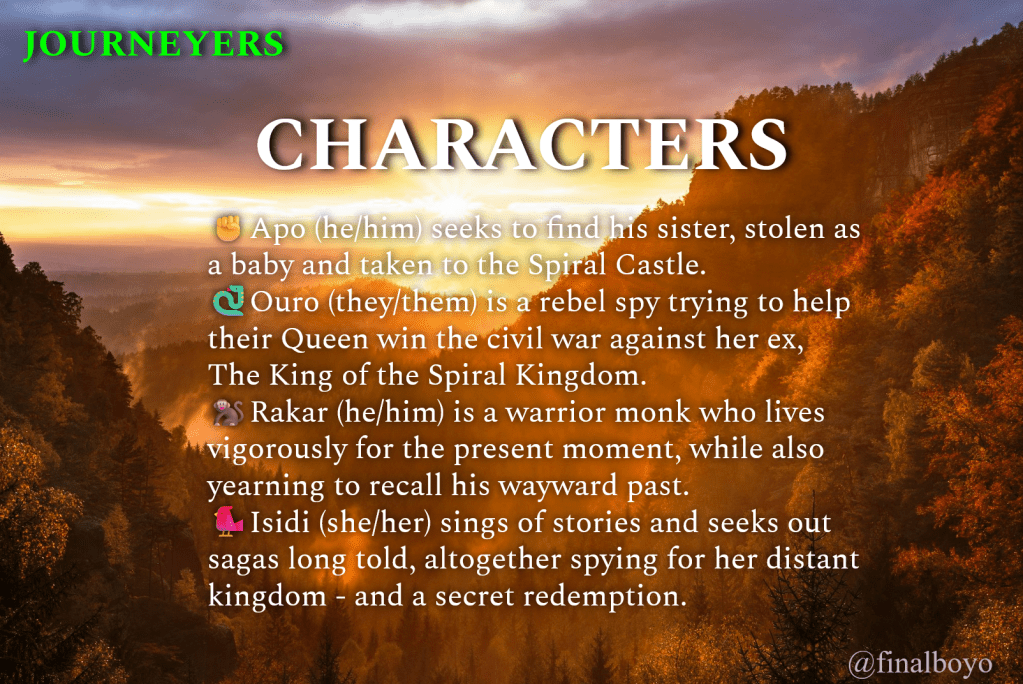 Premise: *JOURNEYERS* is a story about the fantastique of nature. Within the Spiral Forest, animals wield magic like language and resist the empire of Mankind, residing in the heart of the Spiral Castle. Apo is an adventurous human boy entering the forest for the first time to find and rescue his sister, taken from his outside village as a babe. Ouro is a spy snake for the rebel Queen who guerilla fights her ex-husband, the King, from the wilderness of the trees. Rakar is a childlike amnesiac monkey as tough as the core of the earth, searching for his lost tribe and the truth of his origins. Isidi is a bird diplomat from Birdkind’s mysterious city in the sky, come to seek the redemption of a saga she may call her own. Together, these four characters join as one, forming at first as a team to challenge the mystical dangers of the forest, and later as a family journeying deep into historical converse and interpersonal soul descents.