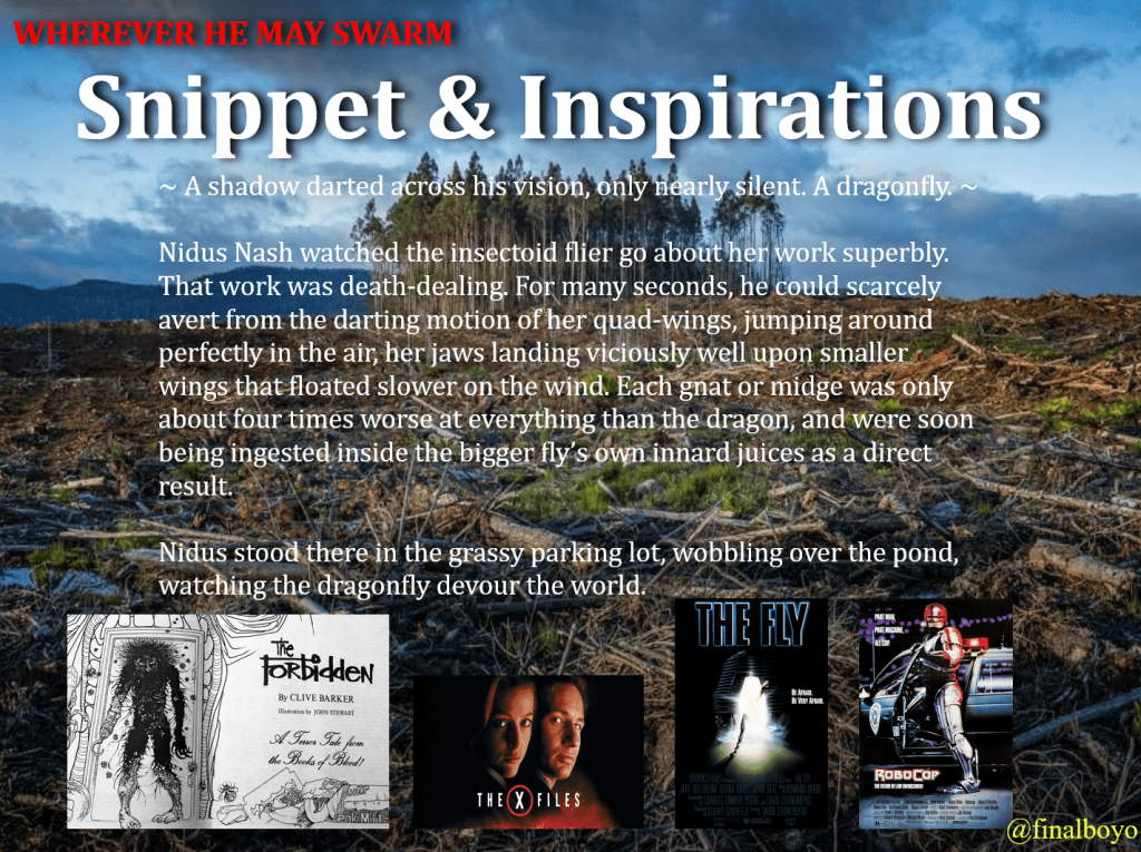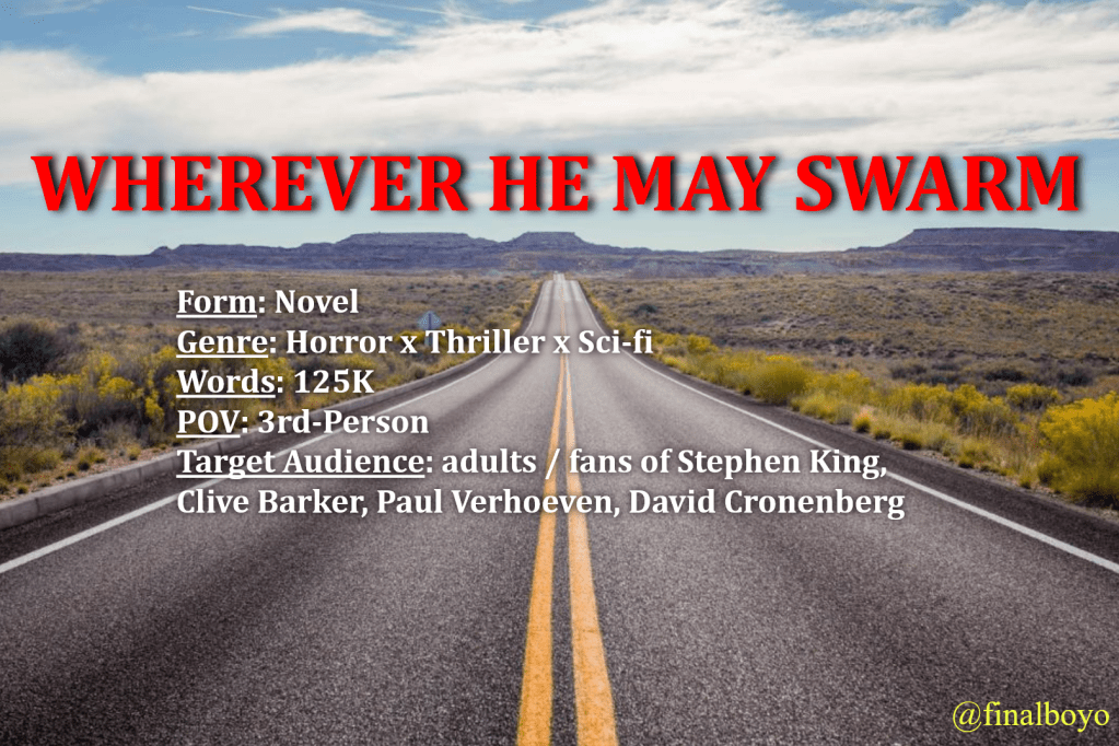 *WHEREVER HE MAY SWARM* is a horror x action x thriller x satire dealing with the prospect of the Holocene Extinction touching down on insects < or > humanity next. Follow Nidus Nash on a road trip across an alternate future America, where the insects are striking back against the empire.